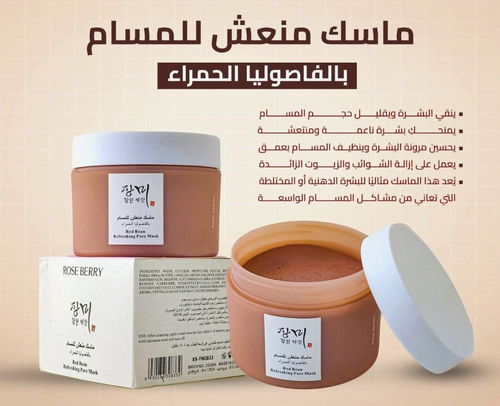 ماسك منعش للجسم بفاصوليا من روز بيري ، منعش للمسام بالفاصوليا الحمراء” من روز بيري. يعمل هذا الماسك على تنظيف المسام بعمق وامتصاص الزيوت الزائدة، بالإضافة إلى تقشير البشرة بلطف وتحسين ملمسها. يوفر شعورًا منعشًا دون التسبب في الجفاف مع ترطيب عميق للبشرة وهو مناسب لجميع أنواع البشرة، خاصةً البشرة الدهنية والمختلطة